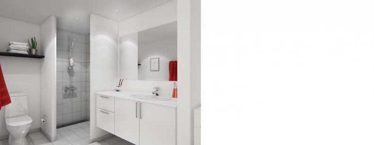 For at bryde facaderne er der på indgangssiden store glaspartier ved indgangene/ trappeopgangene. Glaspartierne går fra gulv til loft og bringer derved lyset ind i trappesektionerne. På facadesiden mod parken er lejlighederne på. 1. og 2. sal forsynet med altaner og i stueplanen er der små terrasser, som giver mulighed for at komme tættere på parken og nyde den flotte natur.