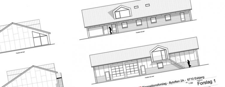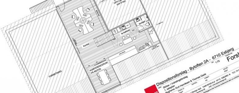 Ombygning - Bytoften HjertingBeliggende i Hjertings mindre industriområde ved Bytoften, ligger der et par erhvervsejendomme opført i 90´erne. Ejendommene har en varieret indretning afhængig af den type erhverv der drives. Bygherren har i forbindelse med erhvervelsen af en af bygningerne, ønsket et forslag med kontorindretning og anvendelse af et uudnyttet tagrum som tidligere er anvendt til lager.