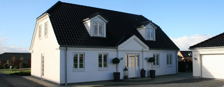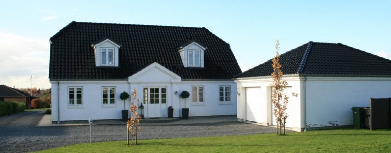 Huset i Jels er opført som et nyklassicistisk hus, mere kendt som et Skagenhus med en fritliggende dobbelt garage med redskabsrum i samme stil.