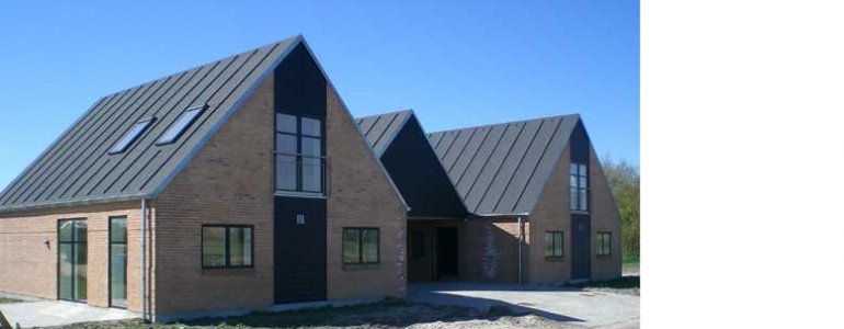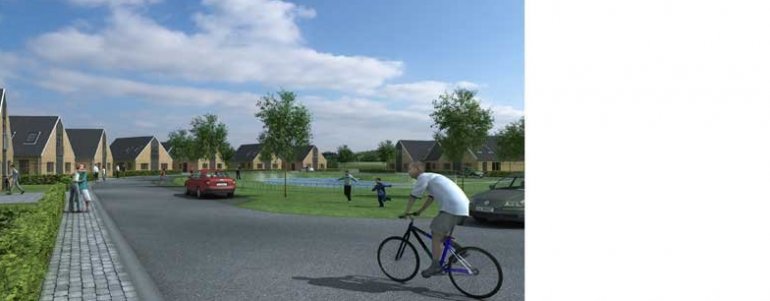 De 16 boliger opføres på et lettere kuperet terræn, hvor boligerne sammenbygges to og to med mellemliggende carporte og redskabsrum.
