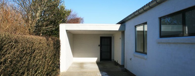 Facaderne bliver vandskurede helt hvide, gavlene mures op i stedet for trægavle og udhænget fjernes og mures op i stedet. Hele taget udskiftes med nye sorte tegltagsten og afsluttes med en kvartrund zinktagrende, også kaldet ”arkitekt-rende”. Sidst men ikke mindst bliver husets carport forhøjet i forhold til det eksisterende og samtidig udbygget med et større redskabsrum bagtil. Den nye carport vandskures i sammen hvide farve som huset og afsluttes i toppen med zinkinddækning der matcher, husets øvrige zink nedløb og tagrender.